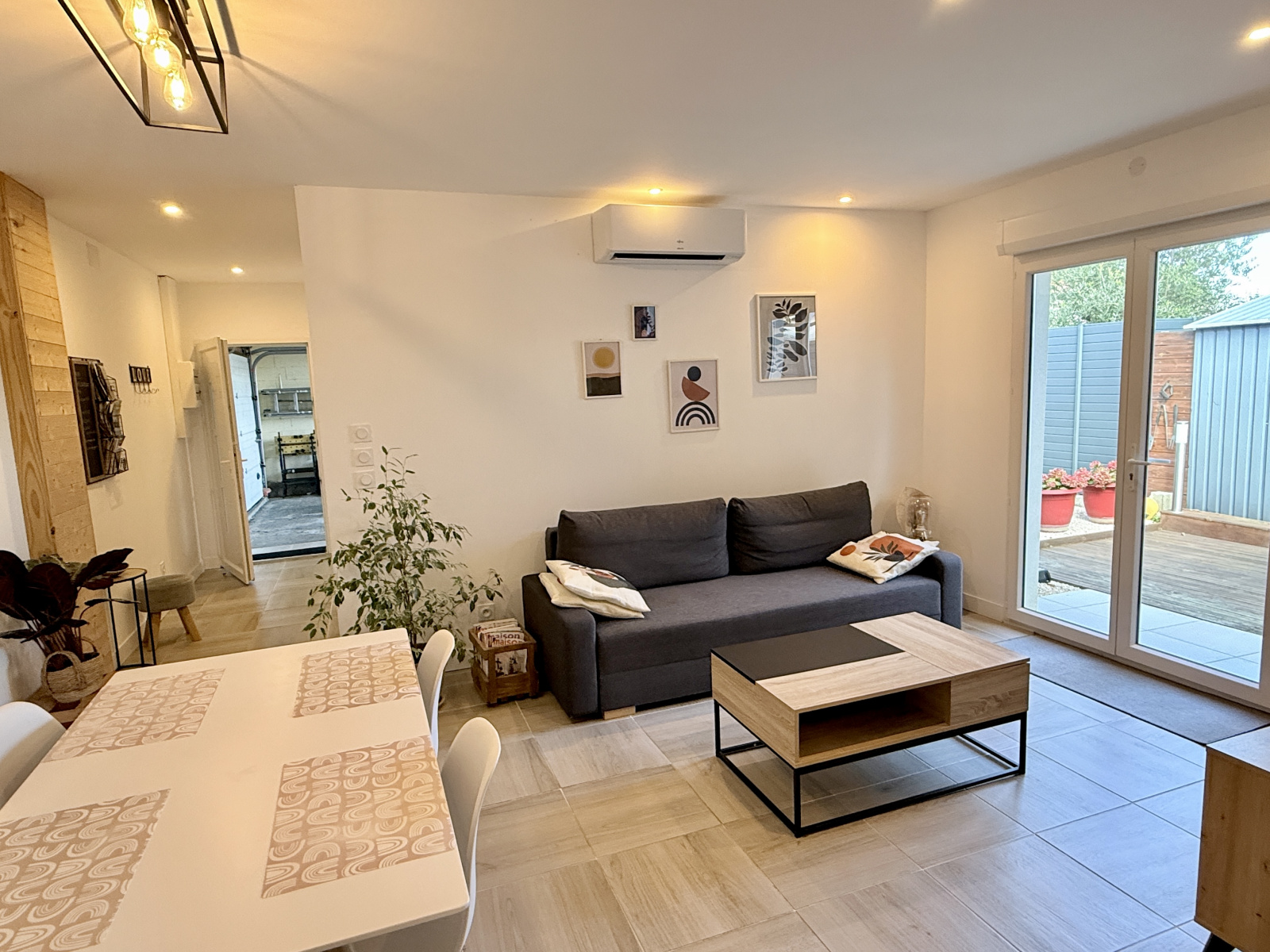 Agréable maison indépendante entièrement rénovée, de type 5, d'une superficie habitable d'environ 116 m2, comprenant les pièces de vie, 3 chambres, salle d'eau, WC, garage, atelier et buanderie de plain-pied ainsi qu'une 4eme grande chambre à l'étage, donnant elle même sur un espace prêt à être aménagé en 5eme chambre, salle d'eau ou salle de jeux si nécessaire.